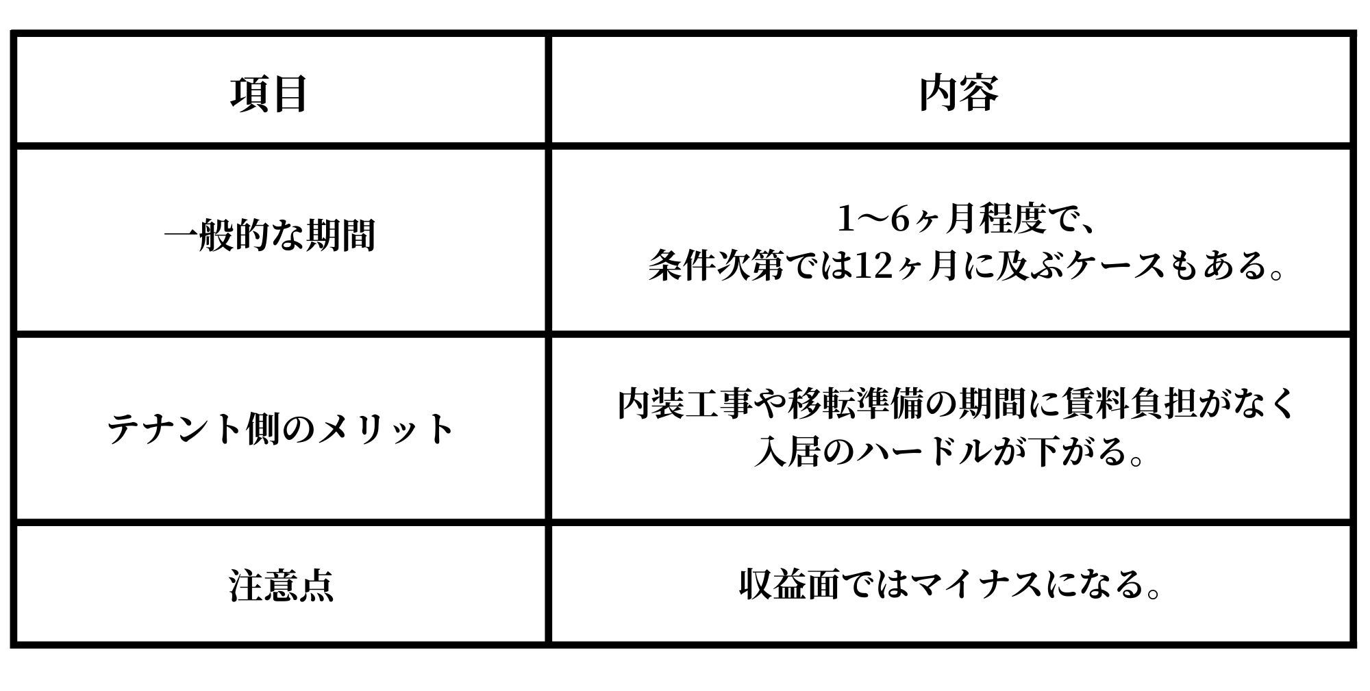 フリーレントとは、入居後の一定期間、賃料を無料または減額する仕組みです。フリーレントについての概要は以下の通りです。