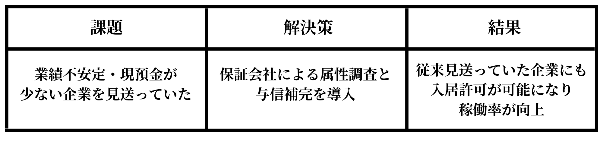 従来の審査基準では入居を見送られがちだった企業層にも、将来性のあるテナント様は多く存在します。審査の視点を広げることで、募集ターゲットを拡大できます。